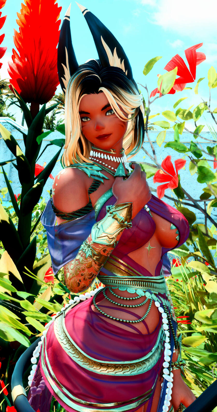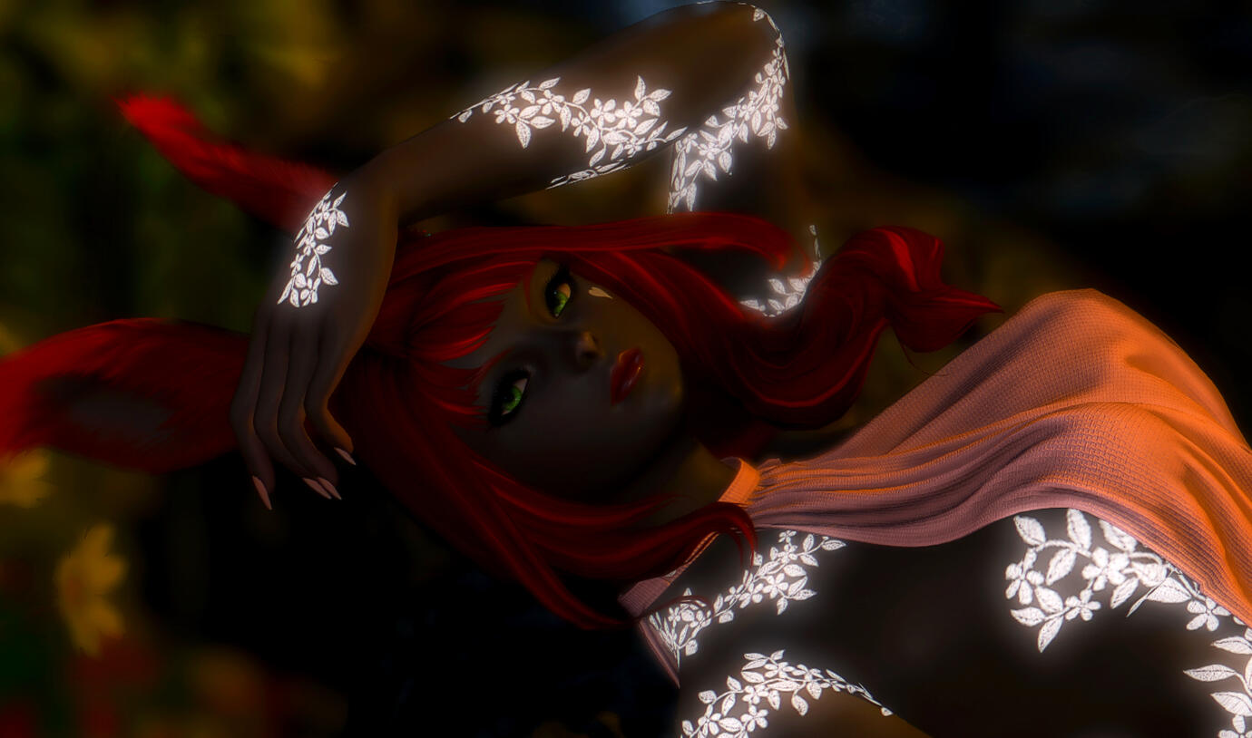 Huda is a striking Miqo’te whose presence carries the hush of silk and lantern light wherever she walks, her movements shaped by years of disciplined dance taught to her in childhood beneath watchful, exacting eyes. What began as art, grace, rhythm, and the quiet language of the body slowly drew her toward the velvet-shadowed world of pleasure houses, where performance and survival blur into something more complicated.She was not raised alone, nor without history.