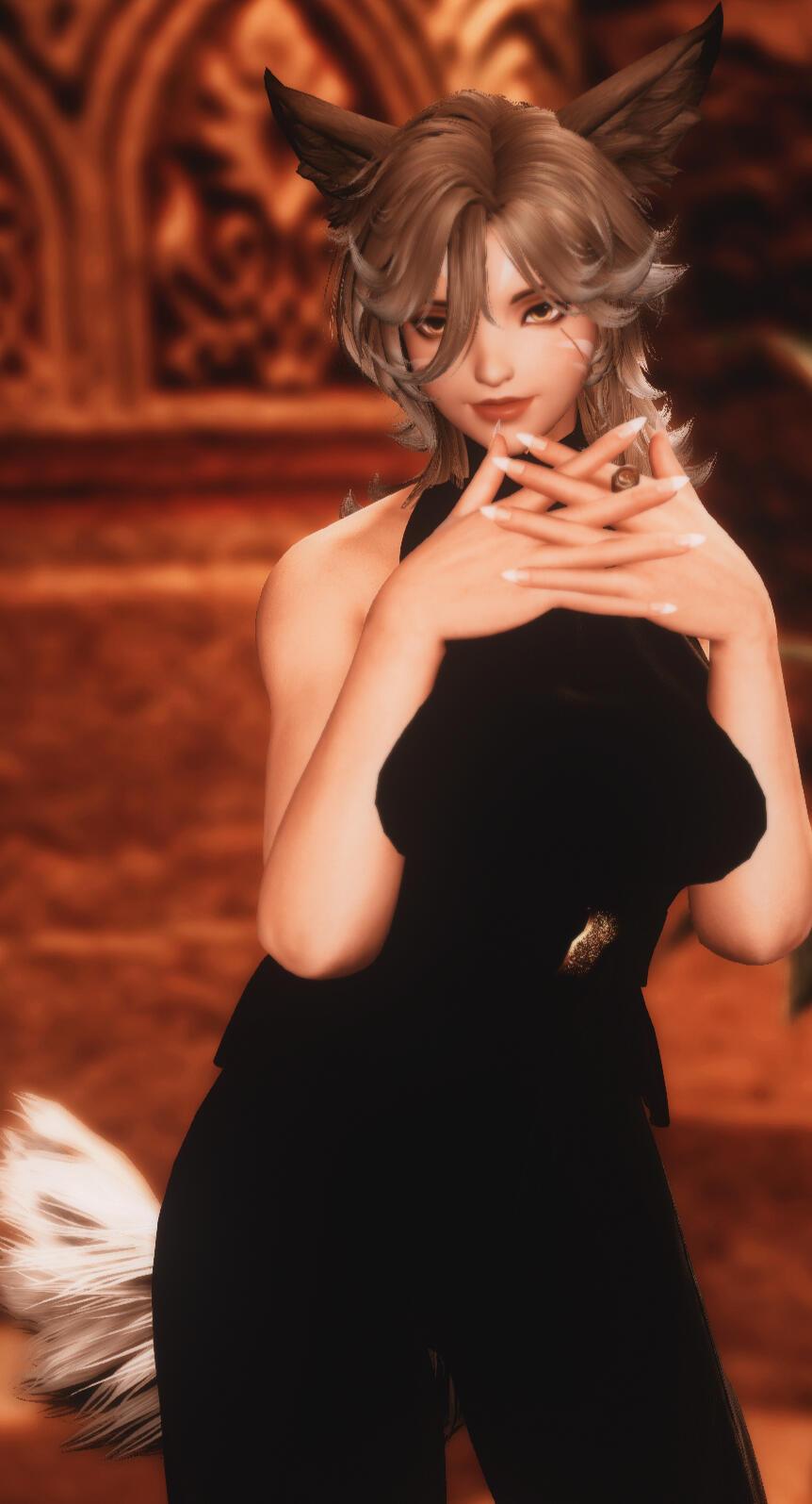 Huda is a striking Miqo’te whose presence carries the hush of silk and lantern light wherever she walks, her movements shaped by years of disciplined dance taught to her in childhood beneath watchful, exacting eyes. What began as art, grace, rhythm, and the quiet language of the body slowly drew her toward the velvet-shadowed world of pleasure houses, where performance and survival blur into something more complicated.She was not raised alone, nor without history.